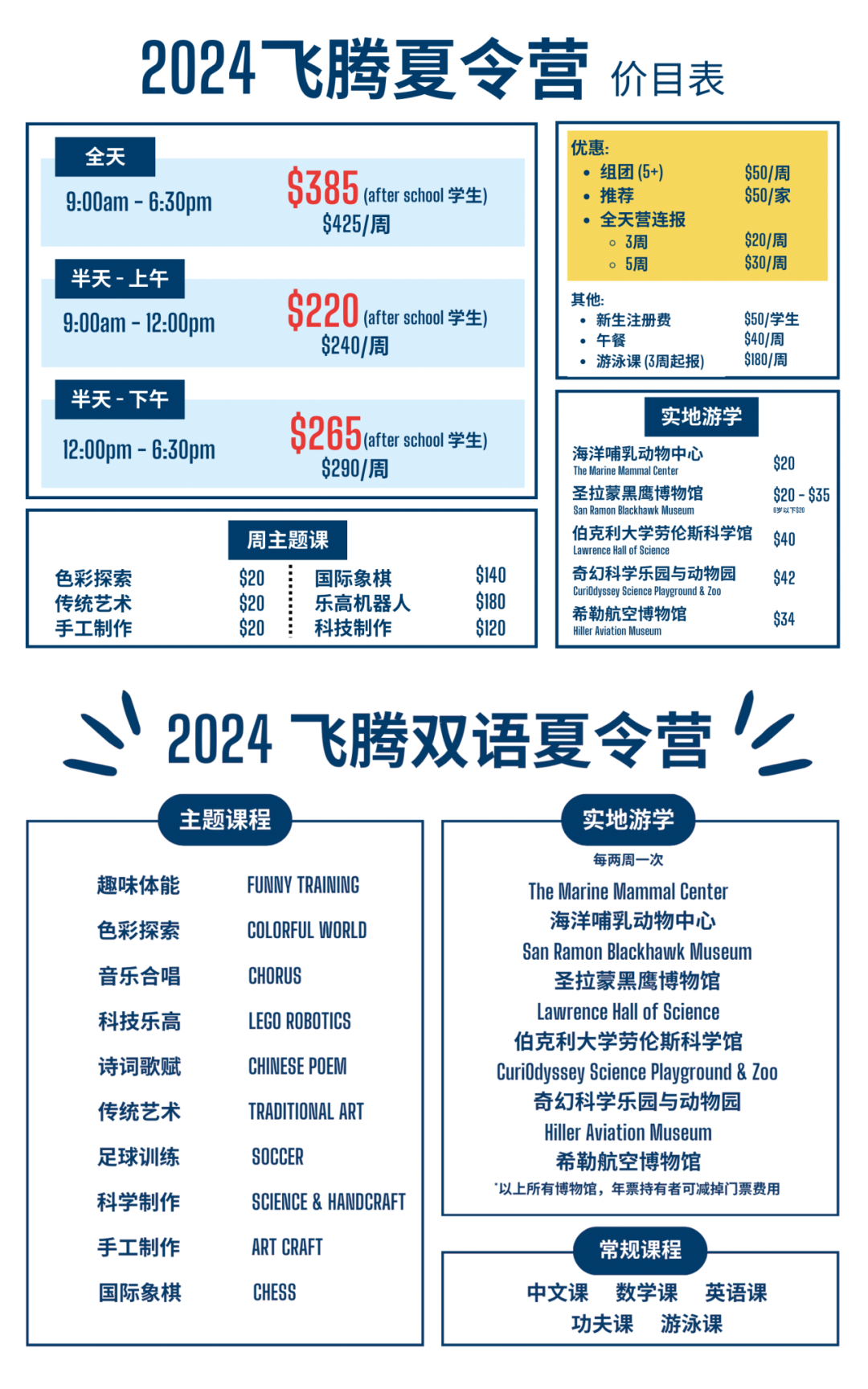 飞腾双语学校 | 2024夏令营介绍Issuing time:2024-02-24 11:02 欢迎加入我们充满创意和乐趣的夏令营,每周一个不同的主题,让孩子在这个暑假中度过充实而难忘的时光。两周一次Field Trip,带领孩子们走出课堂,亲身体验和感受世界,让学习更加生动有趣。更有为孩子们额外安排的专业游泳课程,小班上课,一个暑假可以熟练掌握游泳技能。 ![]() 招生年级:TK-7G 【Fremont Site】 时间:6/3-8/9/24 共10周 (7/4/24独立日 学校休假) 周一至周五,9:00am—6:30pm 学校地址: 37365 – 37371 Fremont Blvd Fremont, CA 94536 报名链接: https://forms.gle/Bzx3hFr2NpB5iddd7 【San Jose Site】 时间:6/10-8/16/24 共10周 (7/4/24独立日 学校休假) 周一至周五,9:00am—7:00pm 学校地址: 1715 Lundy Ave, Suite 128, San Jose, CA 95131 报名链接:https://forms.gle/JUZZhpJGoWWStrYn7 ![]() 「常规课程」 Regular Classes 中文 Chinese 上午:中文基础课 中文课一如既往是我们的王牌课程,依托于国内小学的语文课本,根据海外华裔学生的成长环境和学习需求重新设计。旨在帮助学生建立坚实的中文基础,提高听、说、读、写的综合能力。在扎实基本语言技能的同时,提高思维发展、文学素养培养以及跨文化的理解力。通过与其他小朋友的互动,培养学生的团队合作和沟通能力,使中文学习成为一段愉快而富有成就感的经历。 下午:中文特色课 介绍成语的含义和来源,增强学生的语言理解能力和文化认知水平。讲解常用的谚语,解释其含义和用法,例如“一寸光阴一寸金,寸金难买寸光阴。”,引导小朋友理解和运用谚语,培养他们的语言表达能力和思维方式。了解地道中国文化,包括中国的传统节日、民俗习惯、风土人情等。 ![]() 数学 Mathematics 旨在为学生提供全面而深入的数学学习体验,通过灵活的教学方法和丰富的教学资源,覆盖数学学习的各个方面。从基础概念的掌握到高阶问题的解决,我们注重培养学生的数学思维、问题解决能力以及数学应用的实际技能。 课程设置三个阶段 1. 基础课(Level 1) 注重最基本的数学概念,通过判断学生在数学基础方面的漏洞,查漏补缺,以避免长期问题的出现,弥补在学校数学学习方面的不足。 2. 兴趣课(Level 2) 增加普通学校教学中所欠缺的重要的学习内容,在巩固基本功训练的同时适度加入进阶训练,进一步培养数学的思维与兴趣。 3. 竞赛训练课 (Level X) 对有兴趣参加数学比赛的同学提供专门的训练课程。 ![]() 英语 English 1.母语为英语的学生 专注于提高学生的写作和阅读能力。通过精心设计的课程内容,激发学生对文学和创造性写作的兴趣。阅读材料包括经典文学、当代小说和其他丰富多彩的文本,以培养学生的阅读理解和分析能力。写作方面,我们将注重学生的表达能力、创意构思和写作风格的培养,使他们能够在不同语境中自如表达思想。 2.刚到美国的学生 旨在帮助刚来到美国,对英语环境还不够熟悉的学生,快速适应学校的英语教学。课程内容将涵盖日常口语表达、基础词汇和常见场景中的沟通技巧。课程通过实际情境模拟和语言实践,帮助学生更好地理解和运用英语。此外,我们还关注文化差异,使学生更好地融入美国学校和社会。 两个部分的英语课程均采用小班教学,以确保每位学生都能得到充分的关注和个性化指导。我们的目标是为学生提供全面、系统的英语学习支持,使他们在学术和社交场合都能够自信地运用英语。 ![]() 功夫 Kung Fu Class 以飞师傅为首的教练团队授课,师出名门、经验丰富,熟悉传统武术和现代功夫,在美有20余年的教学经验,培养出多位国家级运动员。孩子们将亲身感受武术的强大魅力和其背后深厚的文化底蕴。通过功夫的学习,学生将更深刻地了解中国武术的文化内涵,培养对传统文化的尊重和理解。学校在湾区拥有丰富的比赛和表演资源,学生都有机会参与全国性的大型表演。 ![]() 功夫基础: 基本功练习,如弯腰、压腿、扎马、力量练习等。简单的基础功法练习,如踢腿、拳法、击打动作等。学习基本的功夫套路拳法,五步拳、查拳、小匕首等。 ![]() 功夫表演: 学习舞龙舞狮等功夫表演的基础动作,包括使用特殊的道具,如狮头、狮尾、龙带等。同时还会学习伴随着的配乐:大鼓和镲等传统乐器的演奏,以及学会如何与音乐合拍、配合动作。同时学生还可能参与节庆庆典或其他特殊场合的演出。 ![]() 游泳课 Swimming Class 与前世界冠军创办的游泳学校合作,室内温水泳池,拥有少年奥林匹克泳道。经过计算机控制和自动化的氯基化学系统,确保泳池中水的清洁、安全和舒适,并有经验丰富的现场工作人员监控。游泳场馆内拥有多名安全人员,确保所有的学生的学习都是安全而愉快的。 小班上课,师生比不超过1:4,连续三周的课程,确保教学质量。 课程根据孩子的游泳水平进行分级,确保每个学生都能在适合自己水平的环境中学习。 ![]() 户外活动 Outdoor Activities 每天午饭后我们会用专车带孩子们到附近的公园进行户外活动,公园有各种体能娱乐设施、棒球场、篮球场和足球场,而且非常小众,几乎看不到其他人,是飞腾的秘密基地。同时为了孩子的安全,我们准备了遮阳帽、防晒霜、防蚊虫药、冰袋和急救包,安全和开心一样都不能少。跳绳、追蝴蝶、捉迷藏;看天、看花草、看猫头鹰,回学校以后还能吃冰冰凉的西瓜,有什么比这样的夏天更美好。 ![]() 「10大主题课程」 10 Weekly Theme 趣味体能 Fu